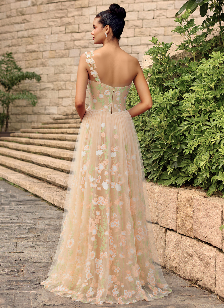 Sleeveless One Shoulder Sweet & Flow Flower Appliques Lace Tulle A-line Maxi Dress With No Leg Slit