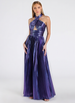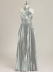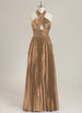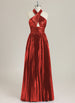 This floor-length metallic prom dress features an elegant A-line silhouette that flatters every figure. The sleeveless design and halter neckline create a sophisticated look, while the delicate pleating adds texture and movement. Perfect for formal occasions, this dress combines timeless style with a modern metallic sheen for a standout appearance.