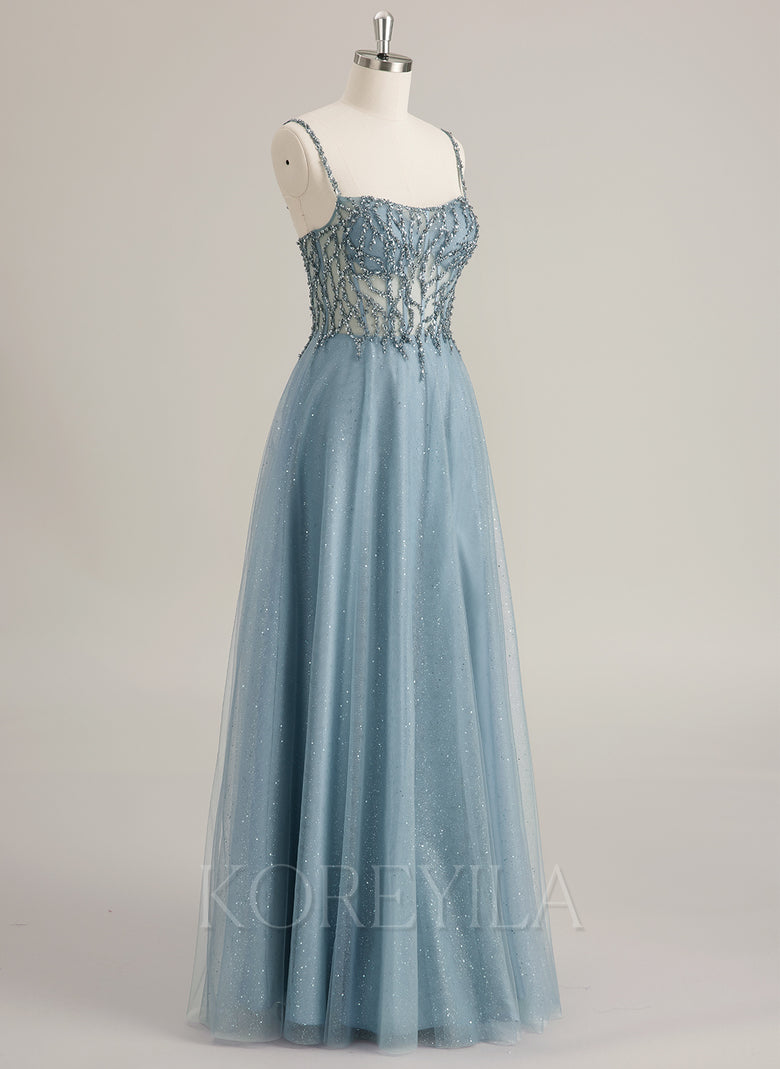 Spaghetti Straps Sweetheart Sexy Sparkle & Shine Sweet & Flow Beautiful Back Beading Rhinestone Sequins Tulle A-line Maxi Dress With Leg Slit