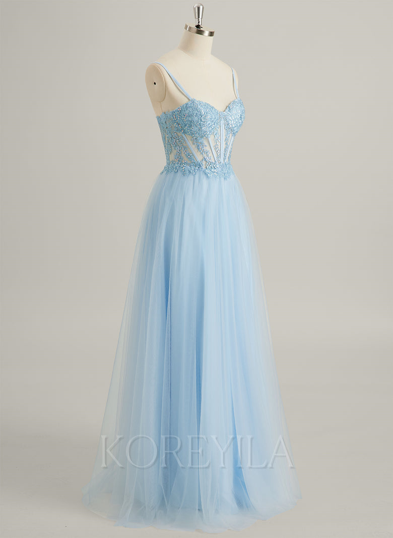 Spaghetti Straps V-Neck Sweet & Flow Tiered Prom Sequins Tulle A-line Maxi Dress With No Leg Slit