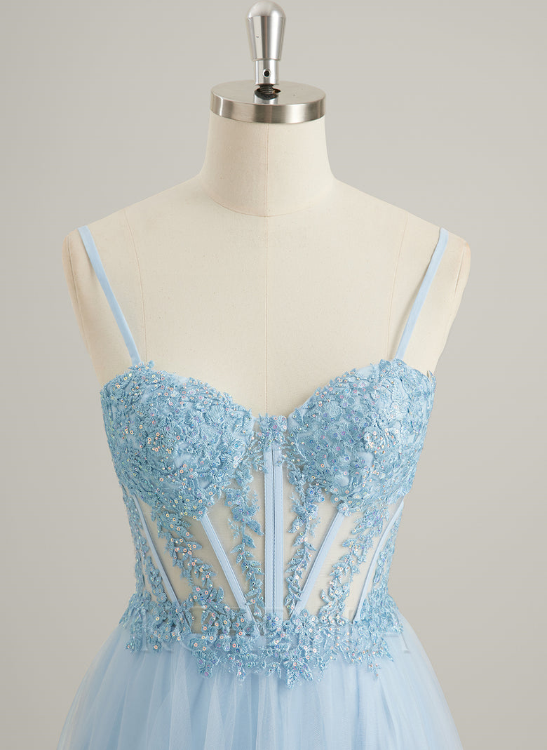 Spaghetti Straps V-Neck Sweet & Flow Tiered Prom Sequins Tulle A-line Maxi Dress With No Leg Slit