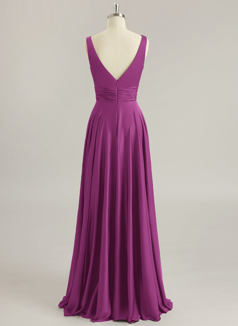 A-line V-Neck Floor-Length Silky Satin Prom Dresses With Pleated