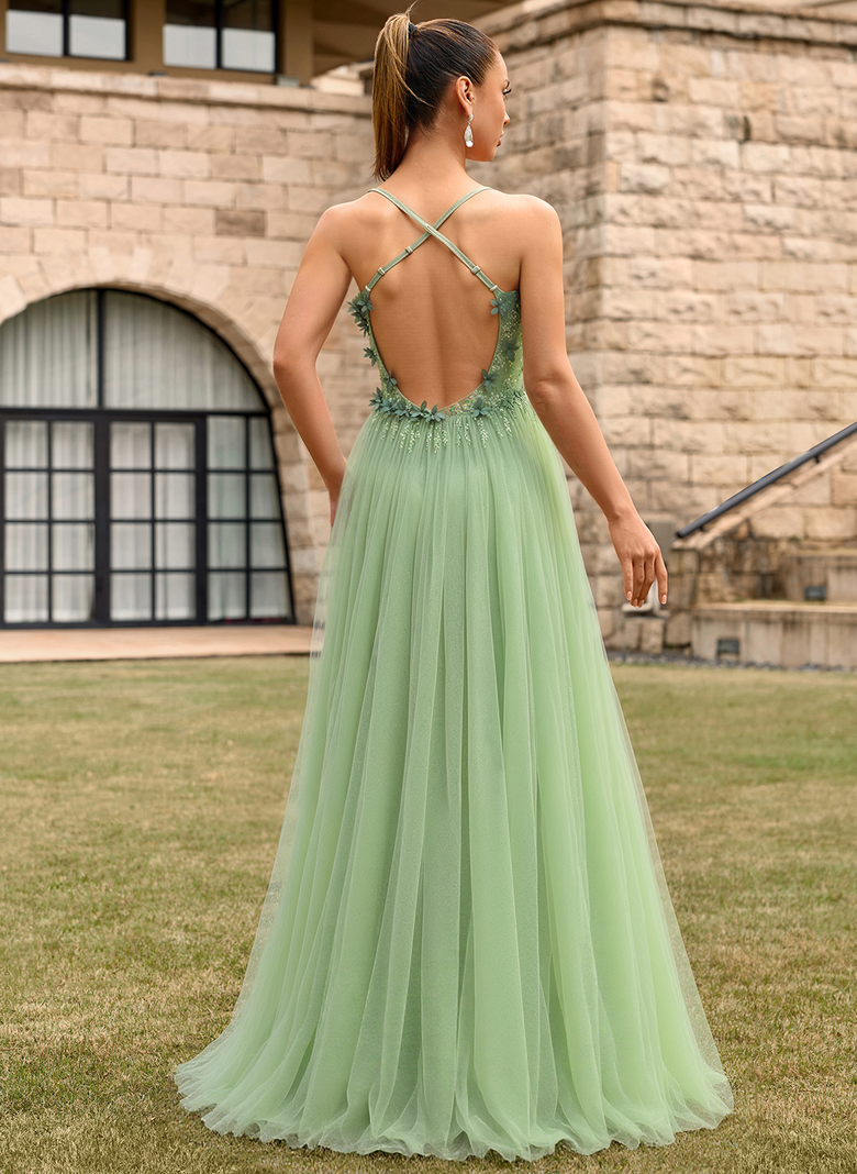 Spaghetti Straps V-Neck Sweet & Flow Flower Sequins 3D Floral Tulle A-line Maxi Dress With Leg Slit