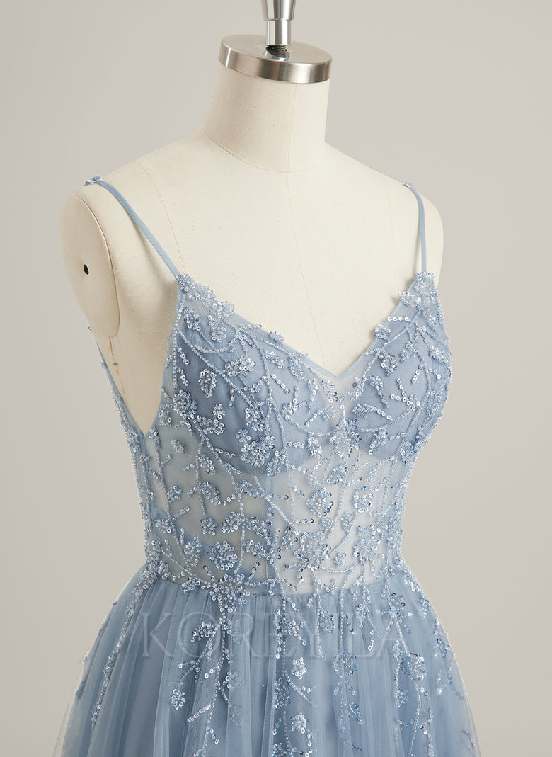 Spaghetti Straps V-Neck Sparkle & Shine Sweet & Flow Tiered Prom Sequins Tulle A-line Maxi Dress With No Leg Slit