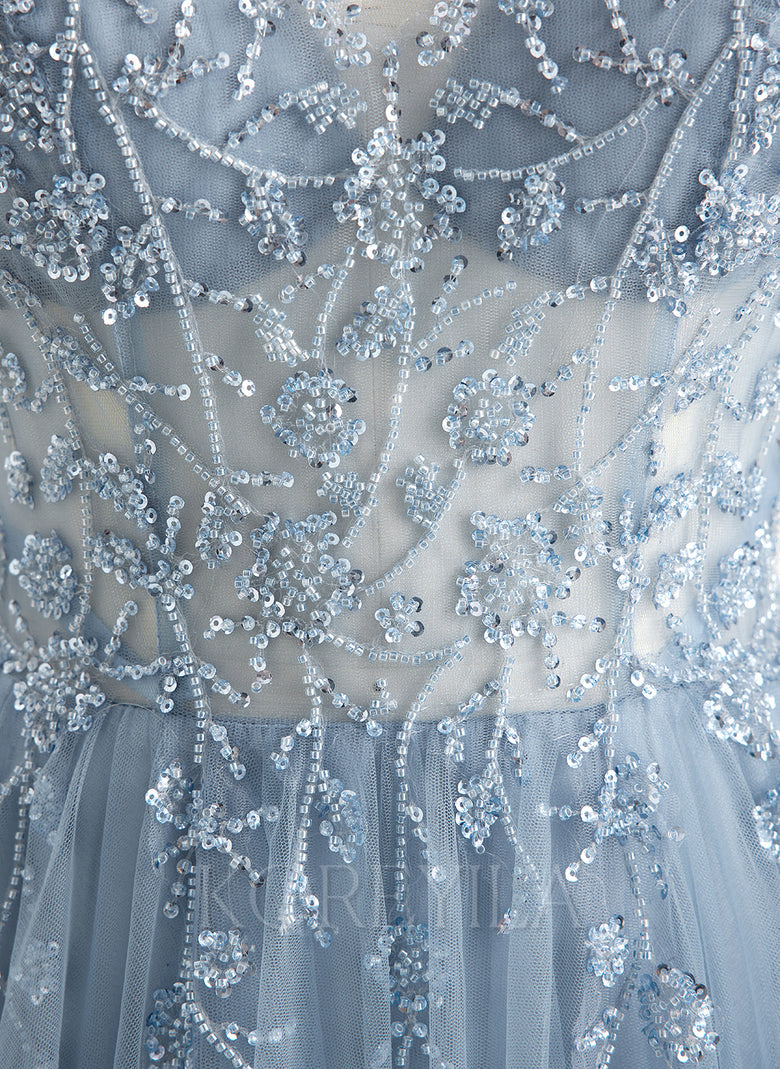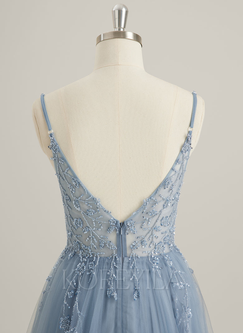 A-line V-Neck Floor-Length Tulle Lace Maxi Dresses With Sequins