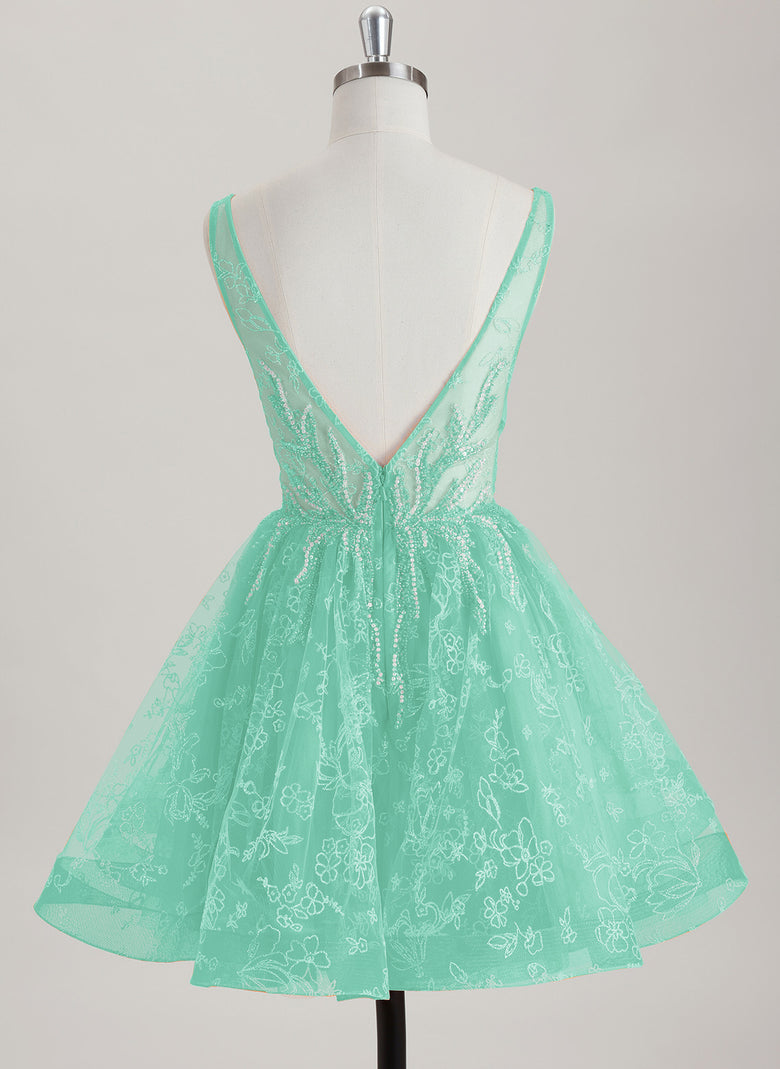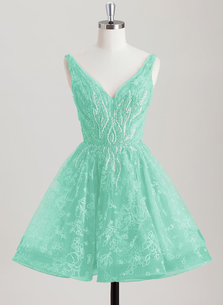 A-line V-Neck Short Lace Tulle Homecoming Dress With Beading Sequins