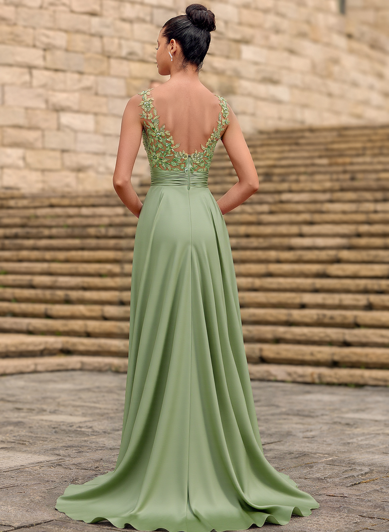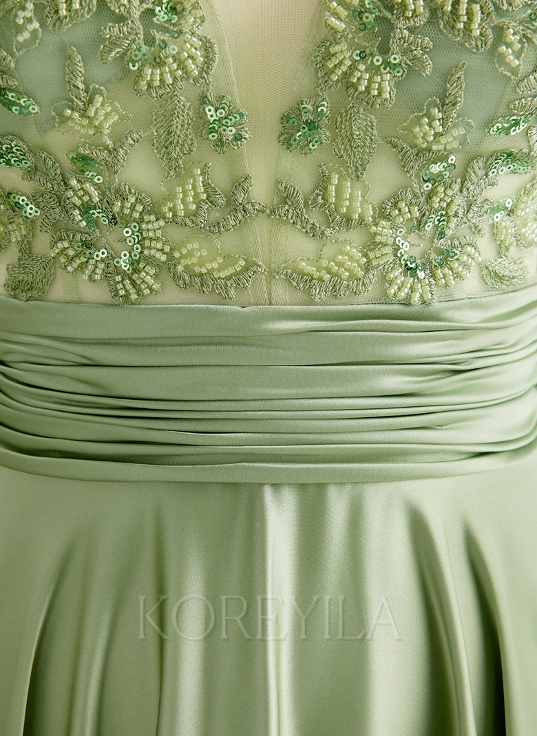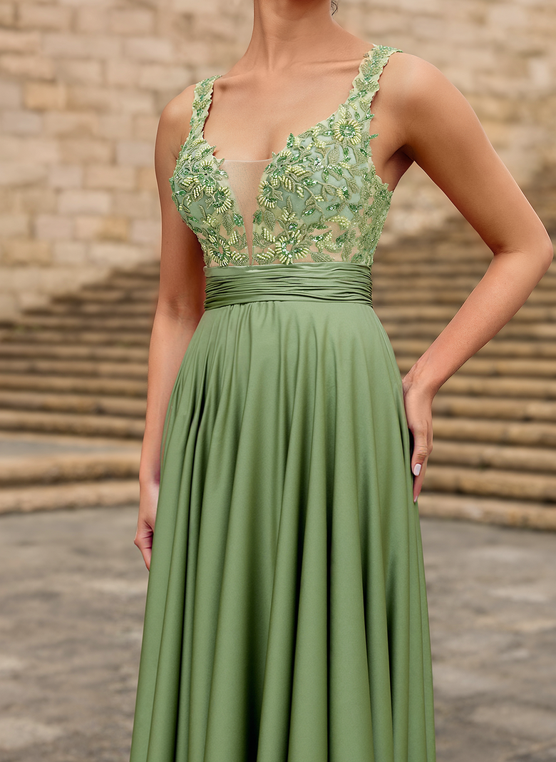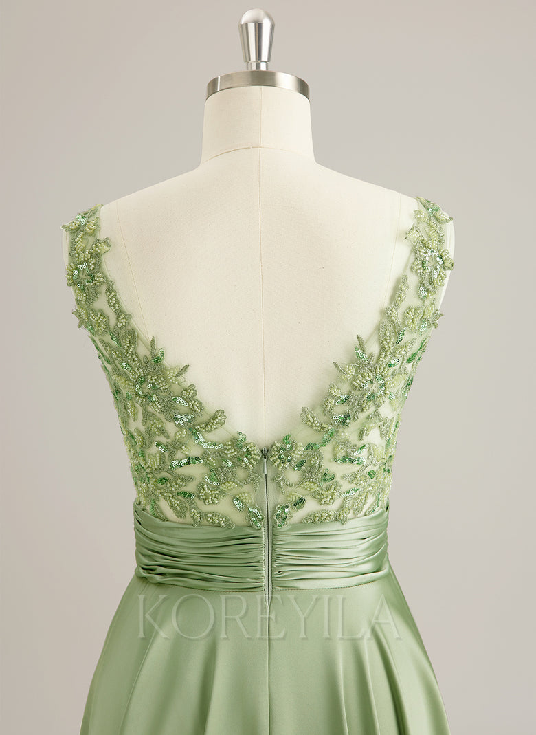 Sleeveless V-Neck Elegant Vintage Beautiful Back Beading Appliques Lace Sequins Jersey A-line Maxi Dress