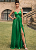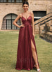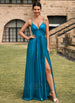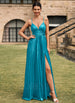 Radiate elegance in this stunning metallic prom dress. Featuring a pleated A-line skirt, a sultry thigh-high slit, and a ruched bodice with a deep V-neckline, this gown is both glamorous and refined. The delicate straps and open back design add a modern touch, making it a perfect choice for an unforgettable night.
