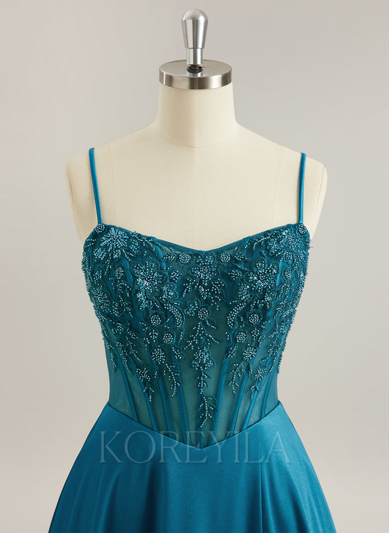 Spaghetti Straps V-Neck Elegant Beautiful Back Modest Prom Dresses Beading Sequins Silky Satin A-line Maxi Dress With Pockets
