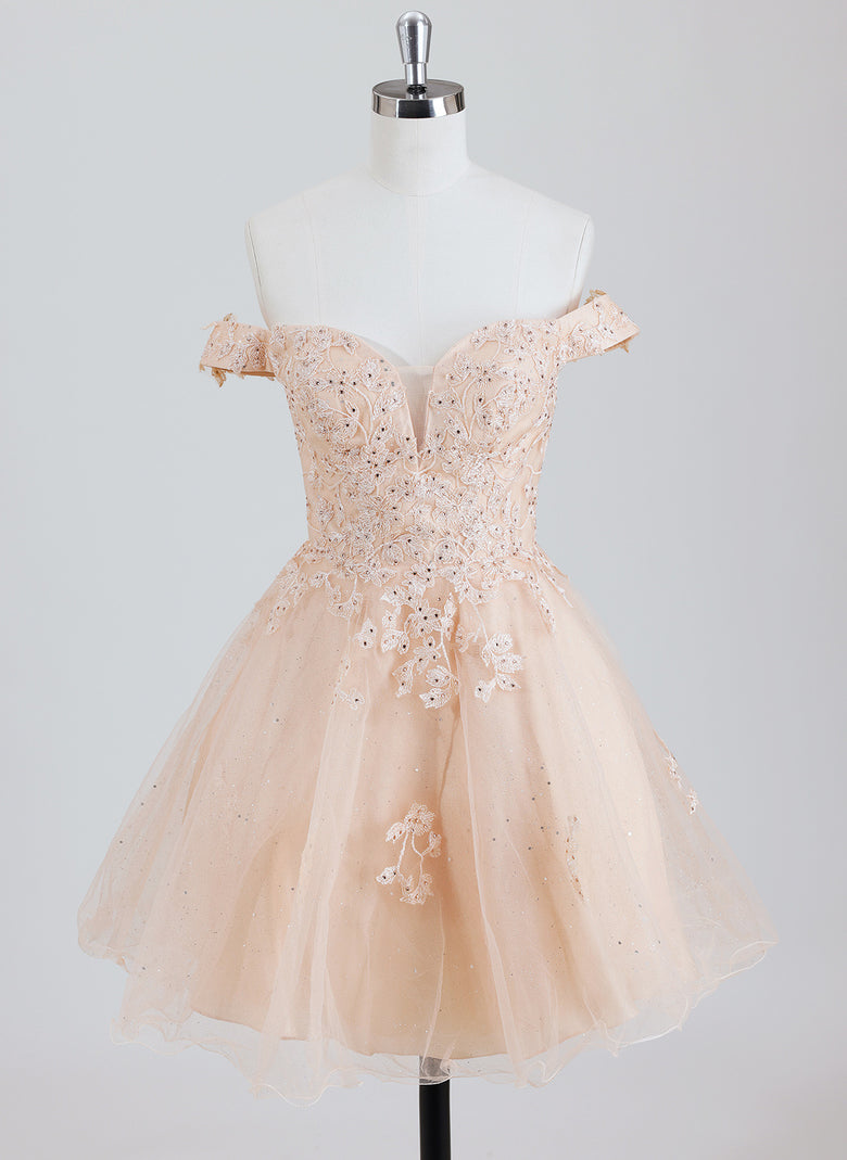 This short ball-gown homecoming dress features an elegant off-the-shoulder neckline and a full tulle skirt, creating a timeless princess silhouette. Embellished with sparkling rhinestones, it adds a refined touch of glamour and sophistication. Designed to combine classic charm with modern elegance, this dress ensures a memorable and graceful presence at any special event.