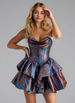 This short ball-gown homecoming dress features a princess silhouette crafted from metallic fabric that adds a subtle shimmer. The sweetheart neckline is elegantly adorned with delicate ruffles, enhancing its romantic appeal. Designed for comfort and style, this dress offers a flattering fit perfect for memorable occasions.