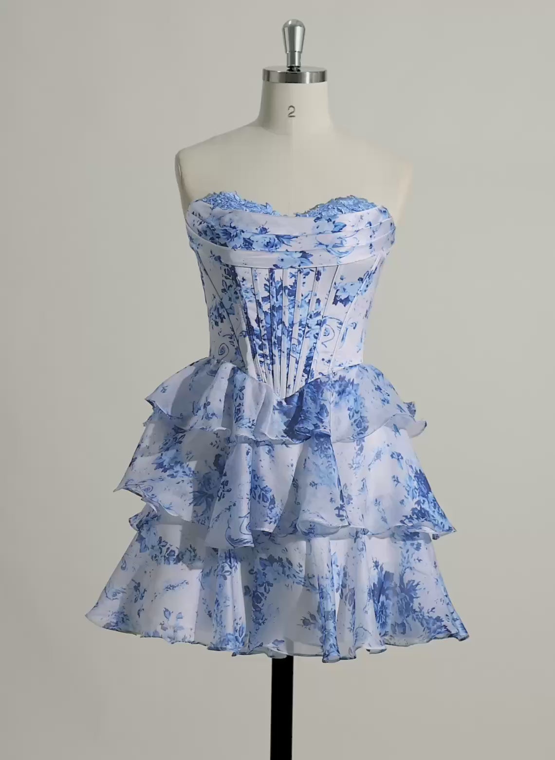 This sleeveless short chiffon homecoming dress features a classic ball-gown princess silhouette enhanced by a delicate pleated neckline. Crafted from blue print floral fabric, it combines elegance with a fresh, youthful charm. The ruffled tail adds a touch of dynamic movement, making it perfect for special occasions where grace and style are essential. The lightweight chiffon ensures comfort while maintaining a refined look throughout your event.