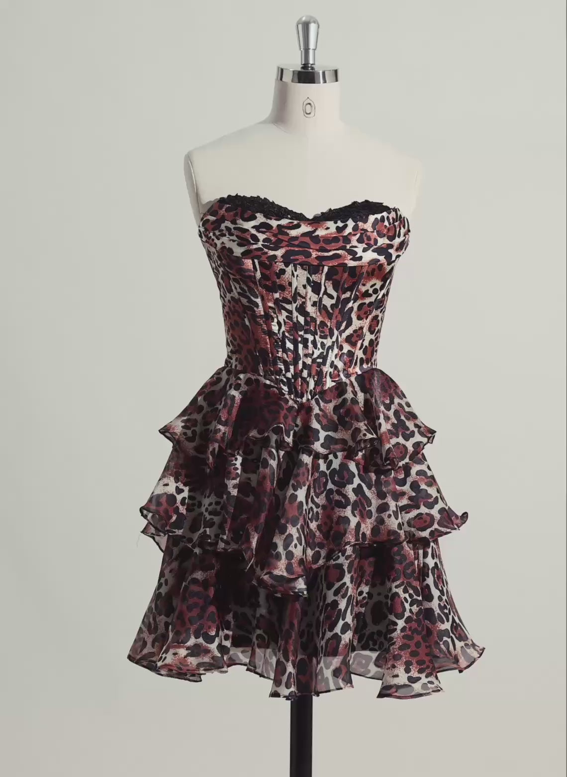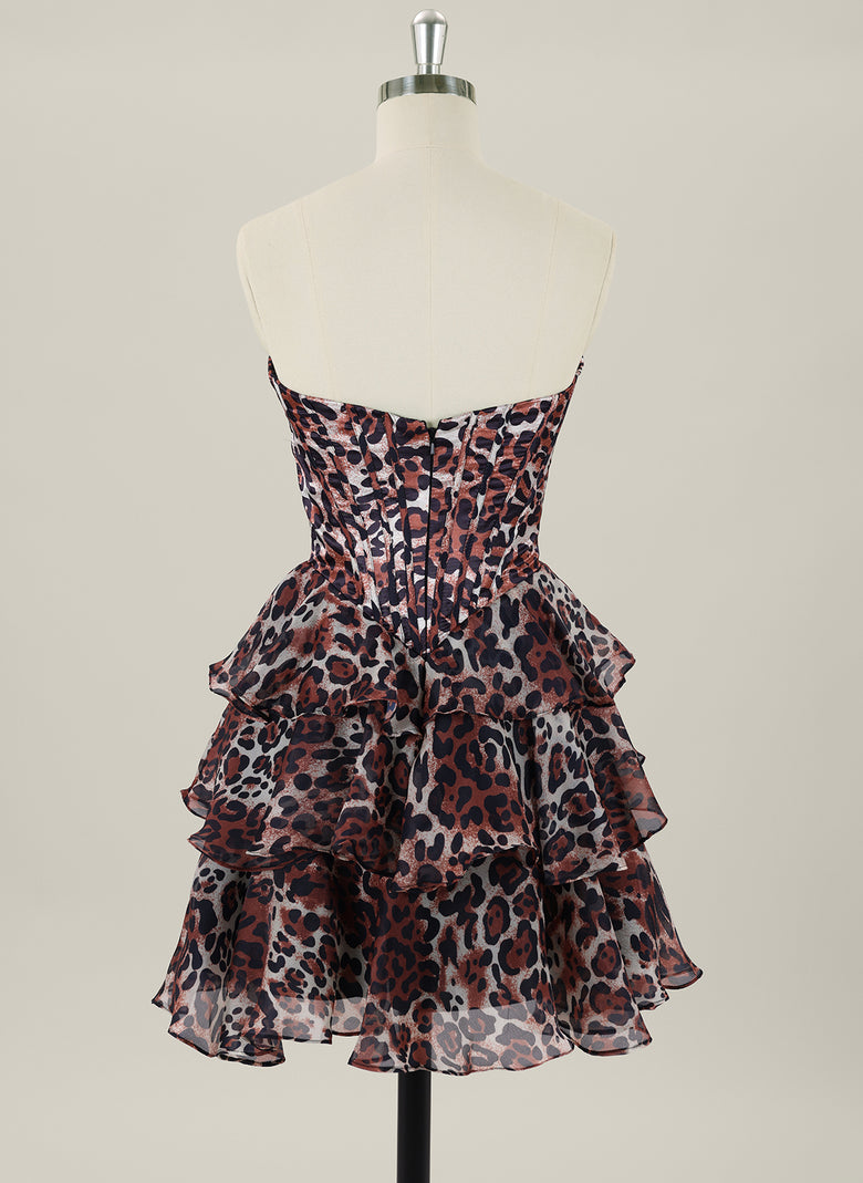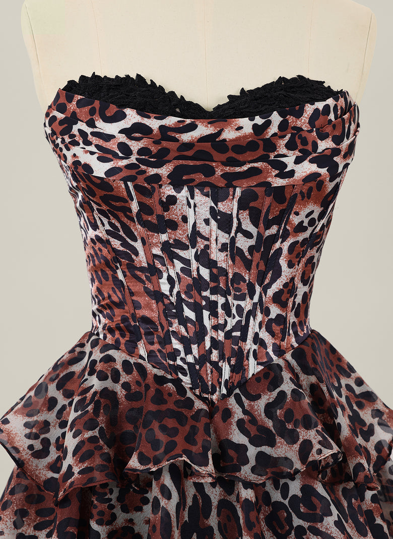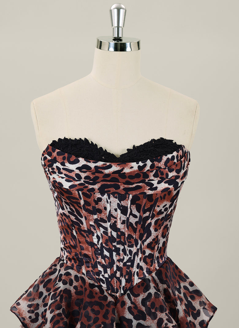 This sleeveless short homecoming dress combines elegance and bold style with its ball-gown silhouette and delicate pleated organza fabric. The striking leopard print adds a modern edge, while the tulle tail enhances movement and drama, making it a standout choice for special occasions. Designed for comfort and impact, it perfectly balances classic princess charm with contemporary flair.