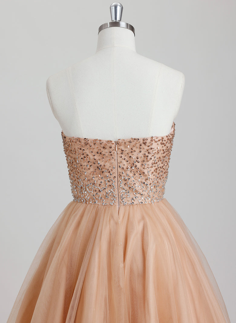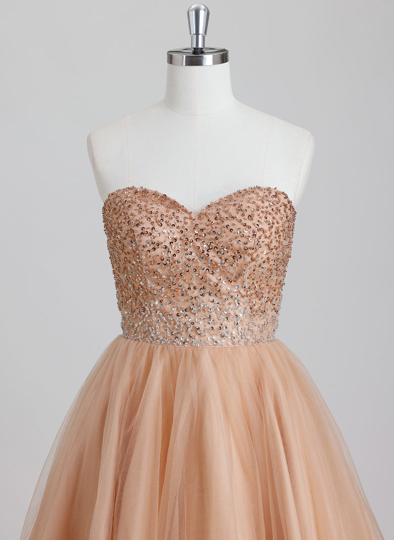 This short ball-gown homecoming dress features a sweetheart neckline and a princess silhouette crafted from soft tulle. Enhanced with intricate beading and sequins, it delivers a refined sparkle that elevates its romantic design. Combining timeless elegance with delicate detailing, this dress offers both a stunning appearance and comfortable wear for your special event.