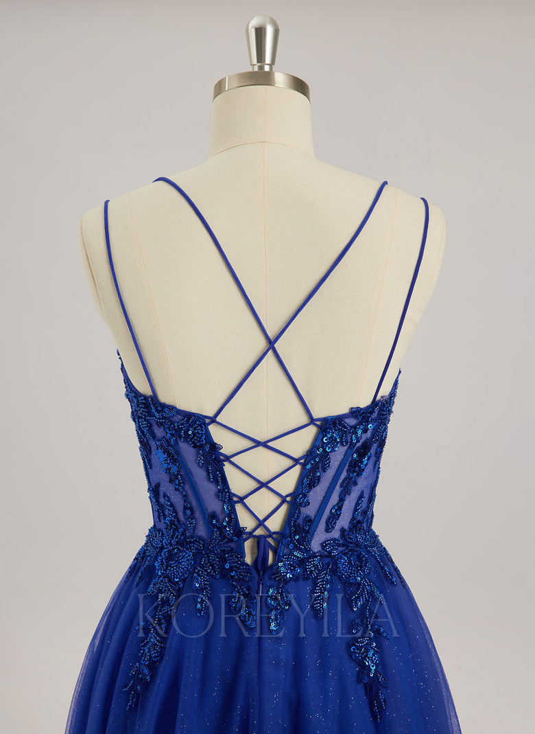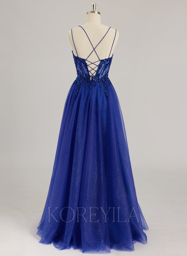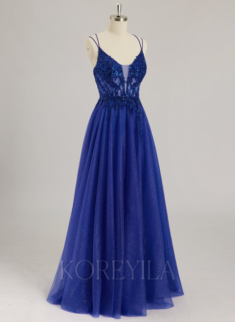 Spaghetti Straps V-Neck Sexy Sparkle & Shine Vintage Beautiful Back Modest Prom Dresses Beading Appliques Lace Sequins Tulle Ball-Gown/Princess Maxi Dress