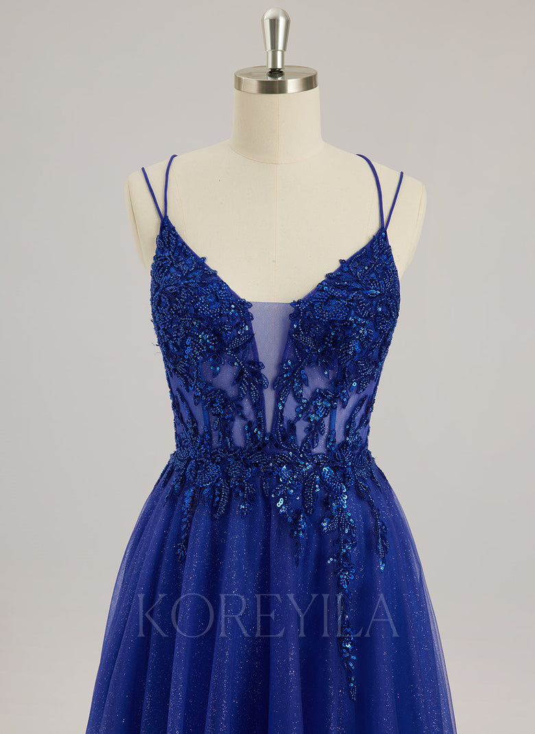 Spaghetti Straps V-Neck Sexy Sparkle & Shine Vintage Beautiful Back Modest Prom Dresses Beading Appliques Lace Sequins Tulle Ball-Gown/Princess Maxi Dress