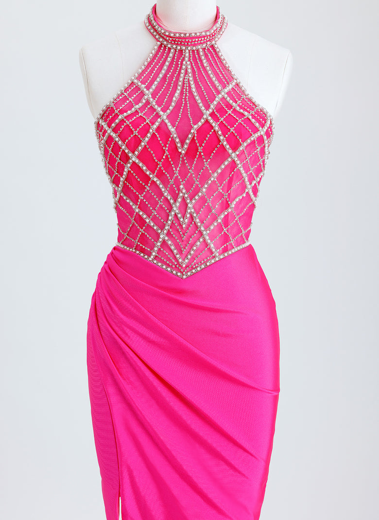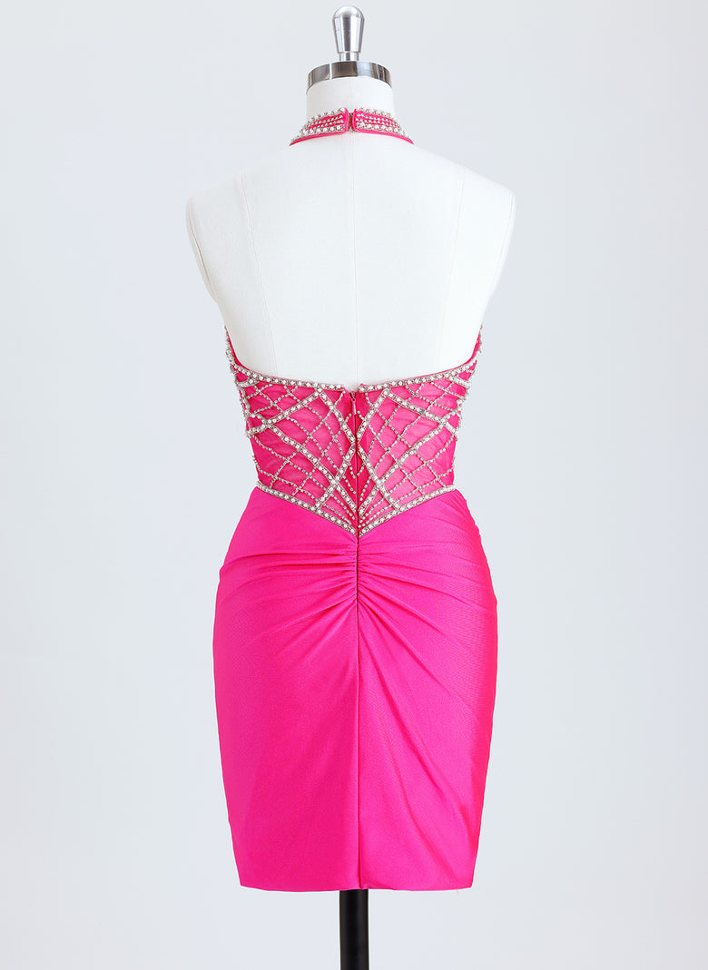 This sheath-style homecoming dress features a flattering halter neckline and a short, column silhouette that enhances your natural shape. Adorned with intricate beading and sequins, it offers a sophisticated sparkle perfect for special occasions. Crafted to combine elegance with comfort, this dress ensures you stand out with refined glamour at your event.