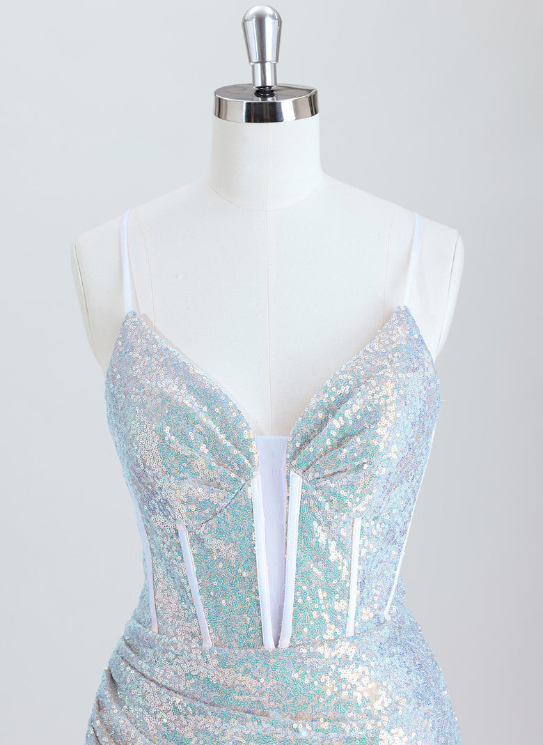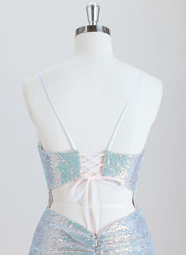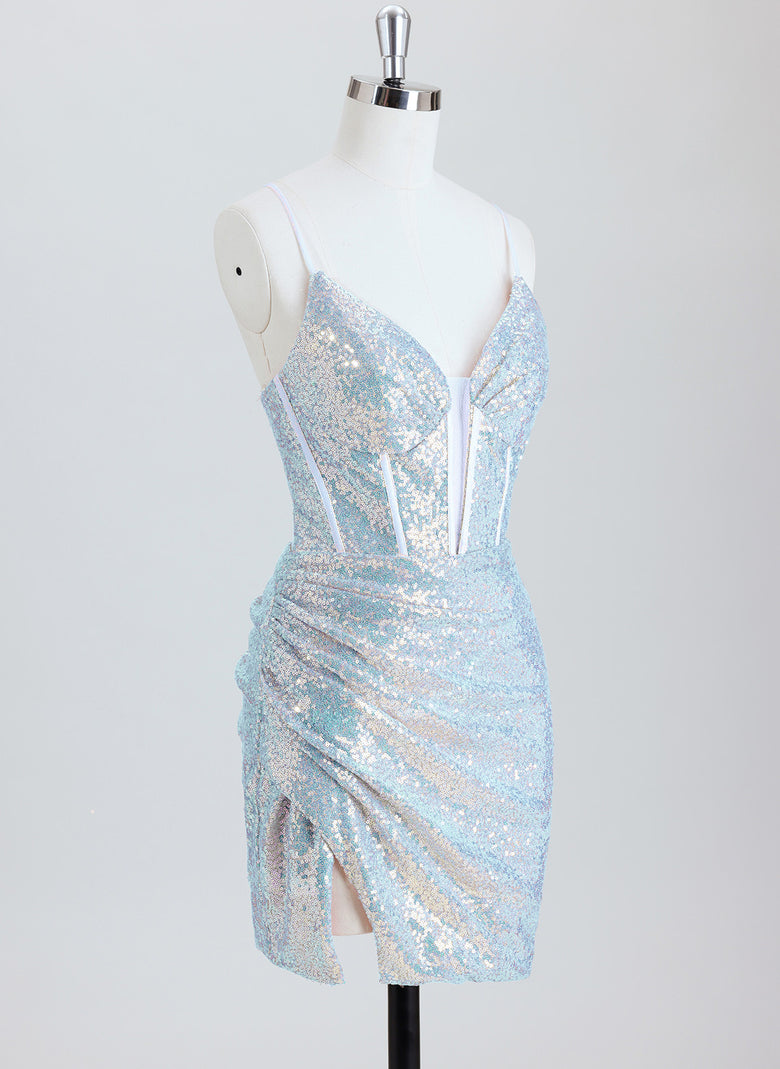 This sheath short homecoming dress features shimmering sequins that catch the light beautifully, creating a dazzling effect. Designed with delicate spaghetti straps and a flattering V-neckline, it offers a sleek silhouette that enhances your natural shape. Perfect for making a sophisticated statement at any special event, this dress combines elegance with a touch of sparkle for a memorable look.