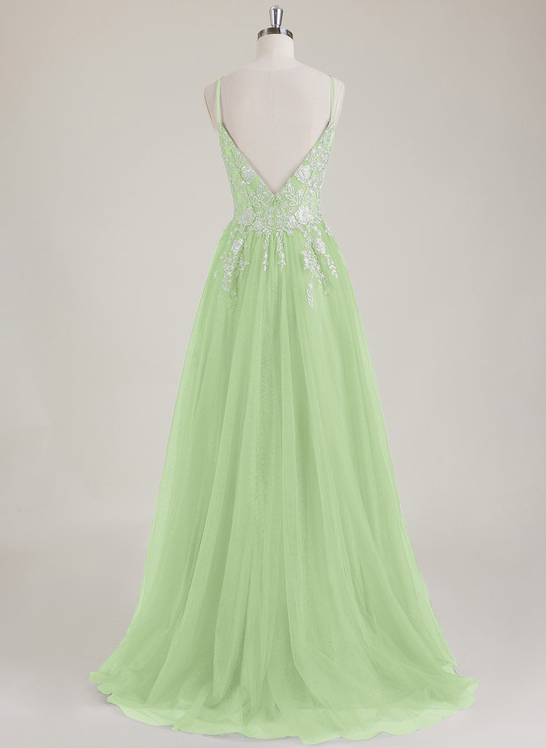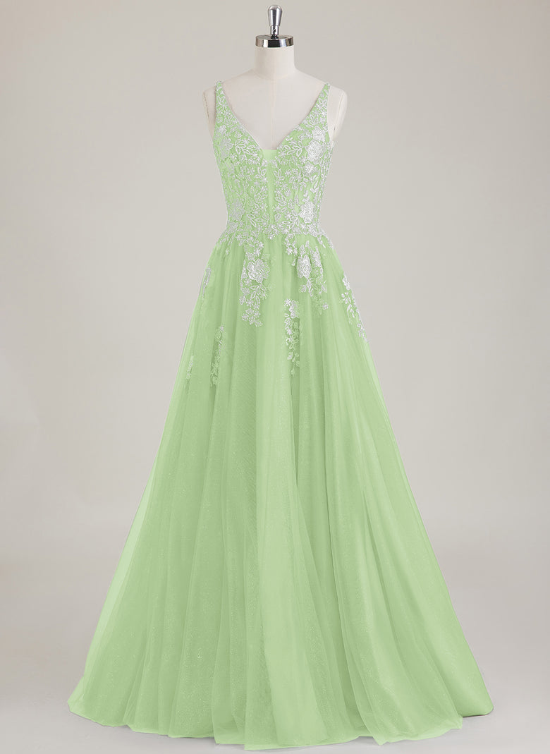 Floral Applique V-Neck Tulle A-line Maxi Dress With Sequins