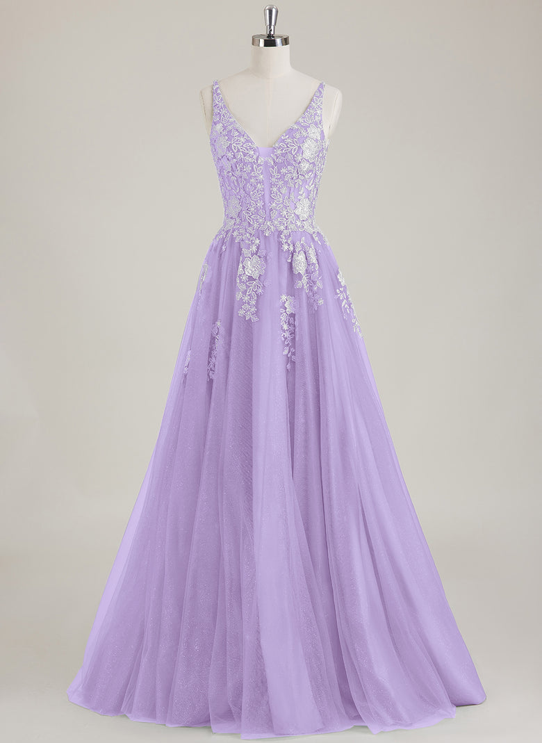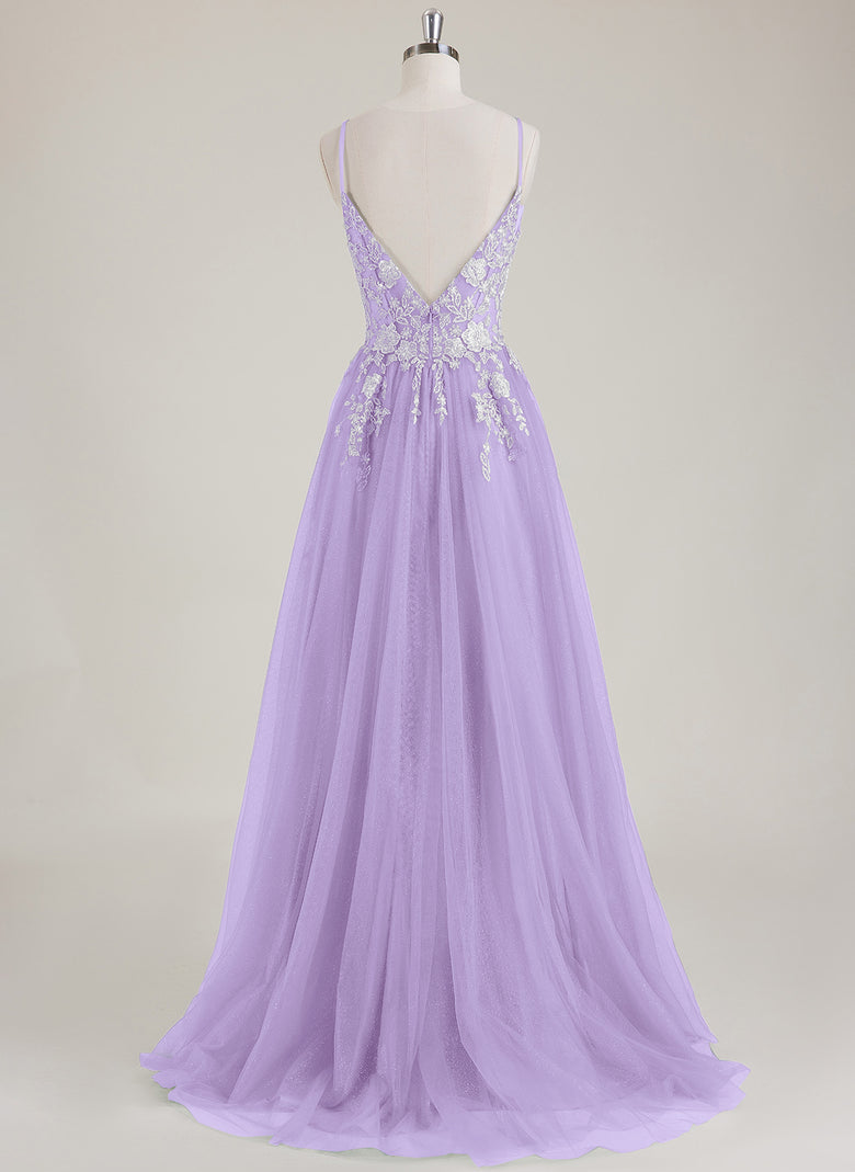 Floral Applique V-Neck Tulle A-line Maxi Dress With Sequins