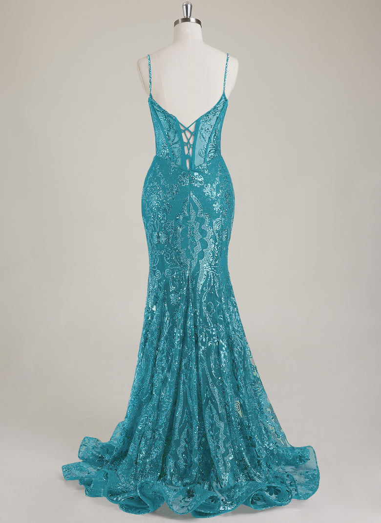 Spaghetti Straps V-Neck Corset Sequins Lace Trumpet/Mermaid Maxi Dress