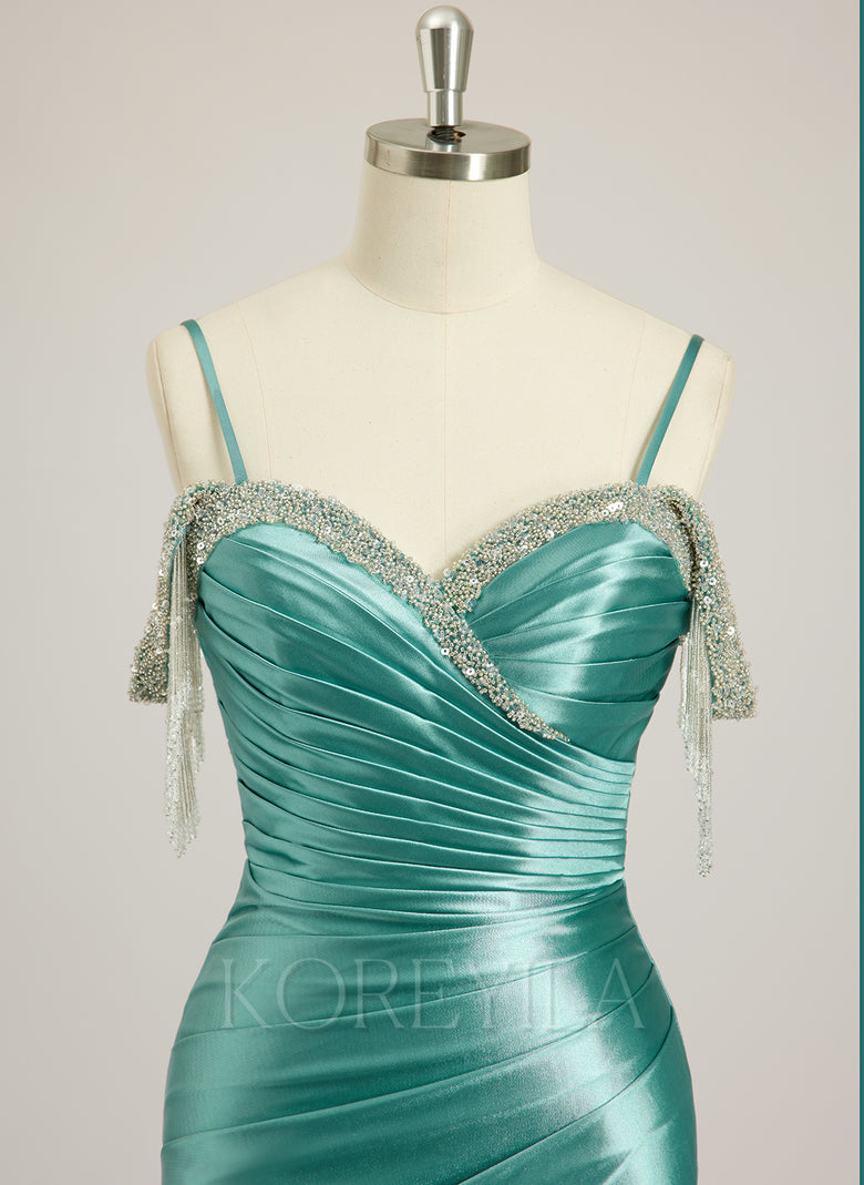 Spaghetti Straps Off the Shoulder Elegant Sparkle & Shine Vintage Beautiful Back Beading Rhinestone Sequins Jersey Trumpet/Mermaid Maxi Dress With Leg Slit