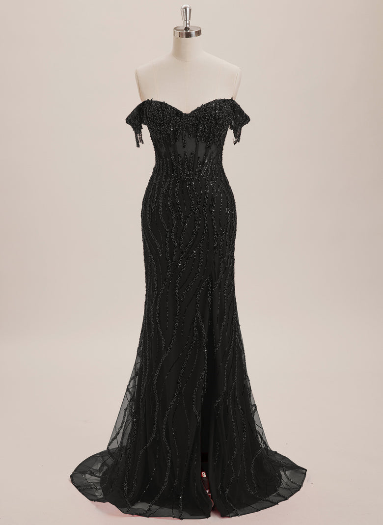 Elevate your style with our Trumpet/Mermaid Off the Shoulder Sequin Maxi Dresses. The hand-applied sequins catch the light, while the sweeping train adds a touch of glamour. Perfect for formal events, this dress will make you feel like a star. Available in multiple sizes.