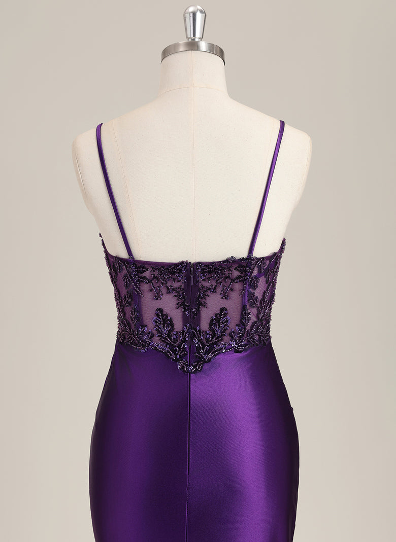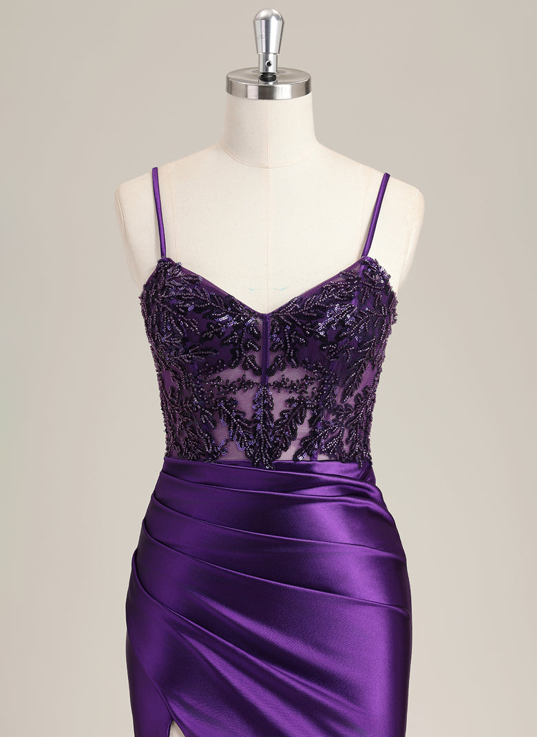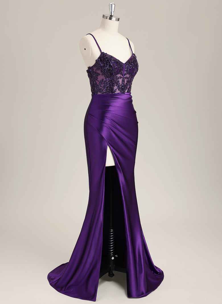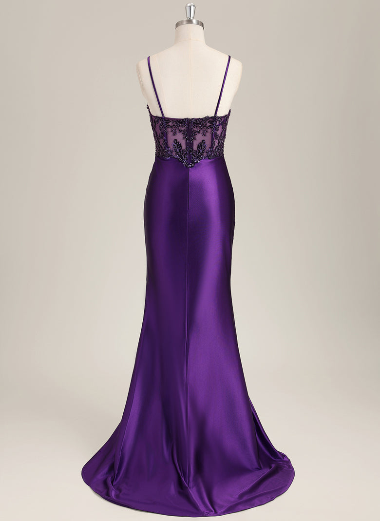 This elegant trumpet/mermaid prom dress features delicate spaghetti straps and a sweeping train, crafted from smooth satin fabric that drapes beautifully. Adorned with subtle sequins, it offers a refined shimmer that enhances its sophisticated silhouette. Perfect for formal occasions, this dress combines classic design with modern detailing to ensure a flattering fit and graceful movement.