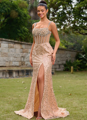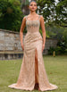Dazzle in this exquisite sequin prom dress. Featuring a corset-style bodice adorned with sparkling embellishments, a daring high slit, and a figure-flattering silhouette, this gown exudes elegance and glamour. The delicate straps and open back complete the look, making it a perfect choice for a show-stopping entrance.