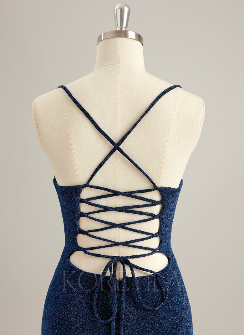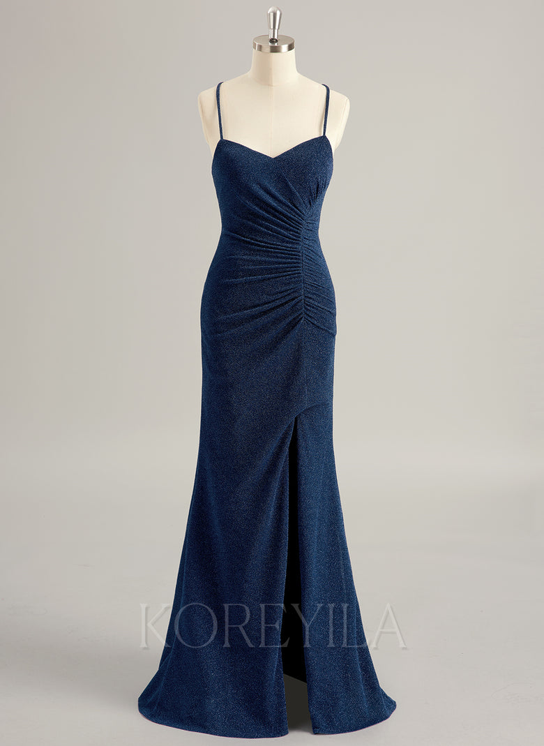 Spaghetti Straps V-Neck Sexy Sparkle & Shine Beautiful Back Modest Prom Dresses Pleated Jersey Trumpet/Mermaid Maxi Dress With Leg Slit