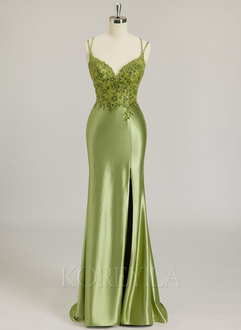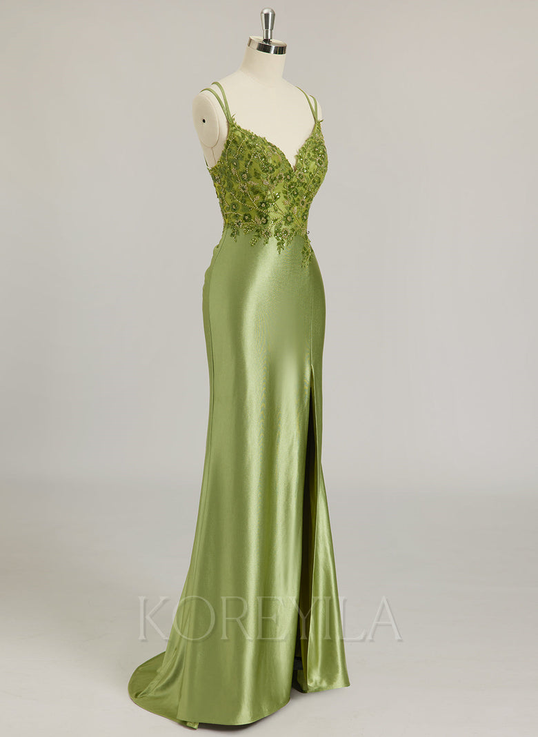 Spaghetti Straps V-Neck Elegant Vintage Beautiful Back Beading Embroidered Sequins Jersey Trumpet/Mermaid Maxi Dress With Leg Slit