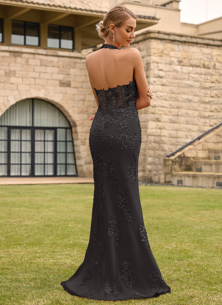 Open Back Halter V-Neck Lace Corset Mermaid Maxi Dress With Beading Slit