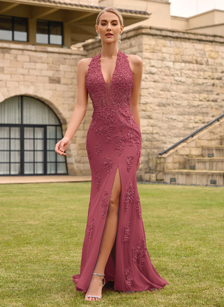 Open Back Halter V-Neck Lace Corset Mermaid Maxi Dress With Beading Slit