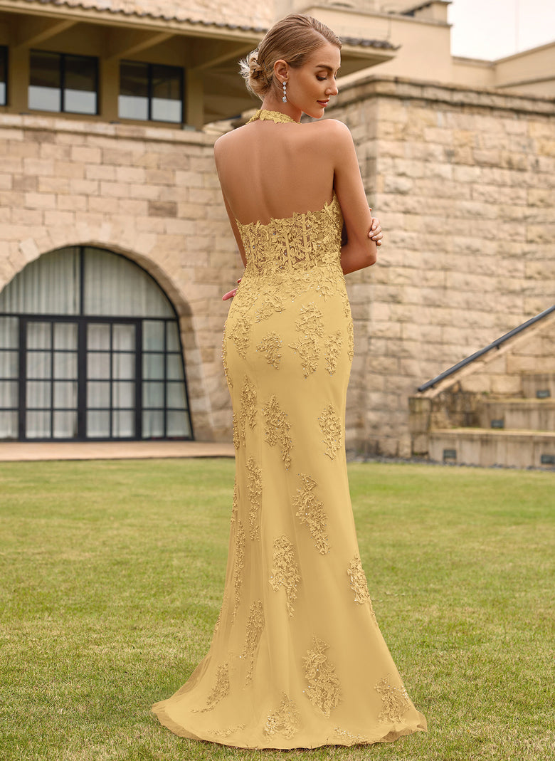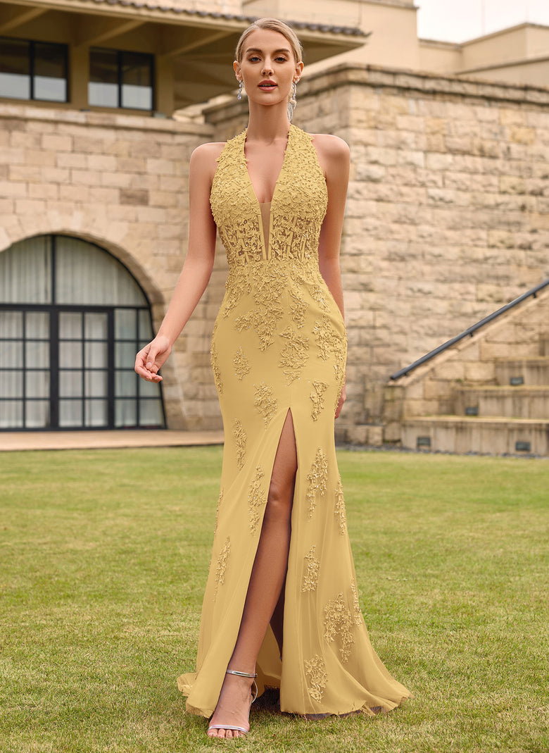 Turn heads in this stunning trumpet mermaid prom dress. Featuring a halter neck, deep V-neckline, and dramatic open back, this dress offers a bold, elegant look. The corset-style bodice cinches the waist, while the mermaid silhouette accentuates your curves. Intricate lace and beading adorn the entire gown, adding a touch of glamour to this show-stopping design.
