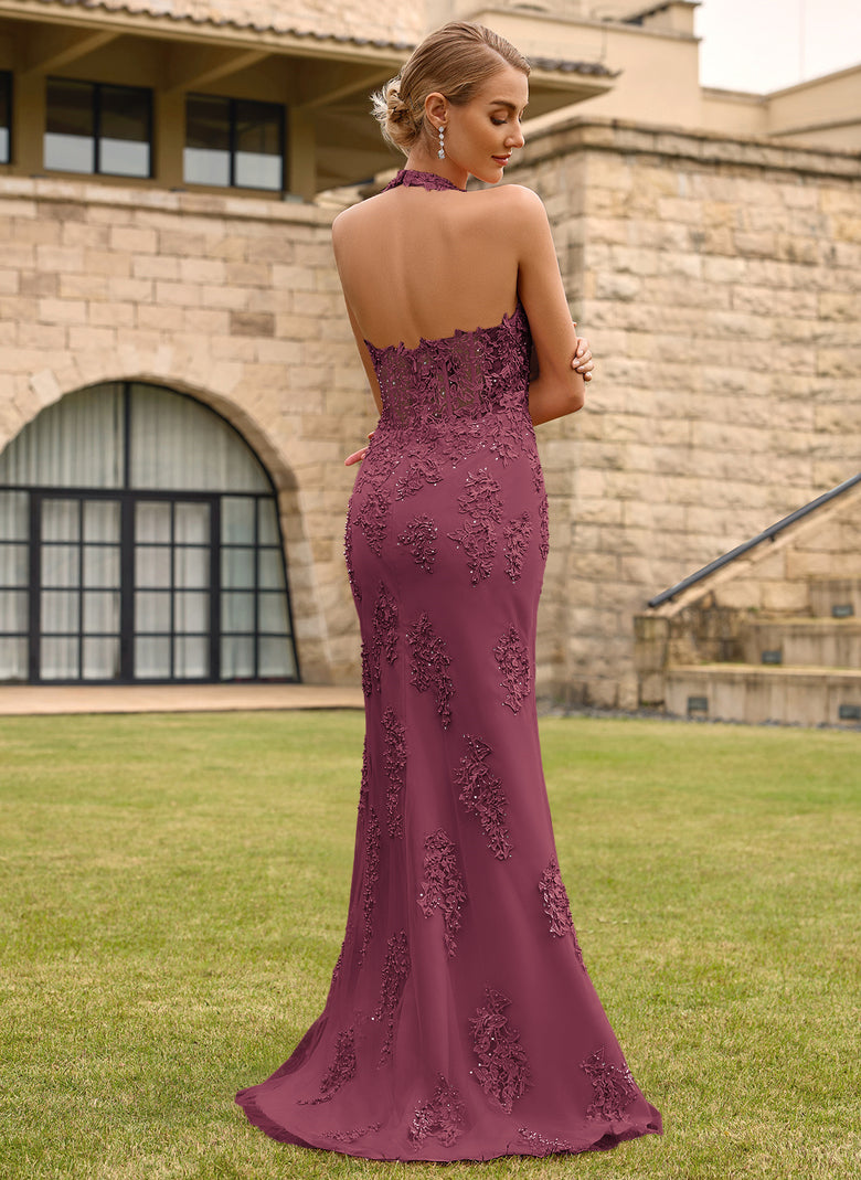 Open Back Halter V-Neck Lace Corset Mermaid Maxi Dress With Beading Slit