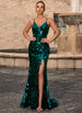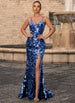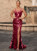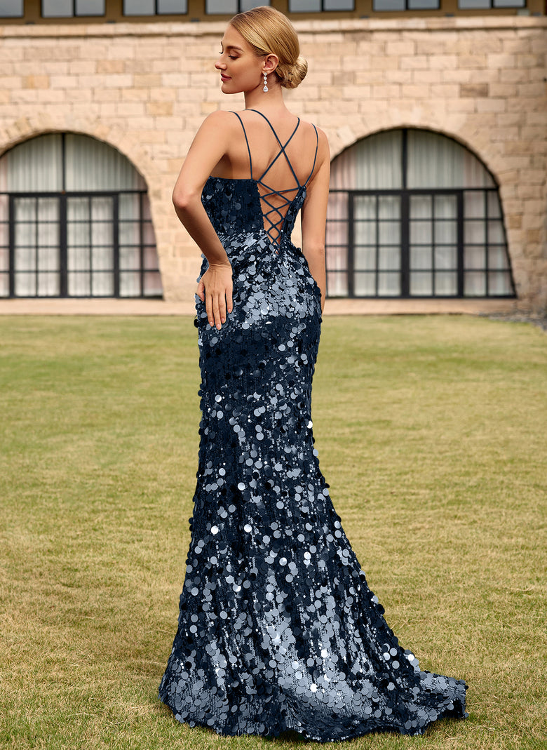 Shine bright in this dazzling prom dress. Covered in shimmering sequins, it features a curve-hugging silhouette, a sultry thigh-high slit, and a chic crisscross lace-up back. Perfect for making a bold and glamorous statement, this dress ensures you'll be the center of attention all evening.