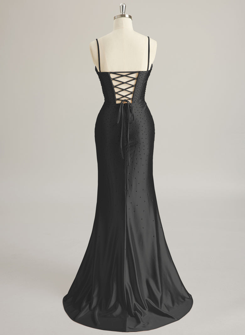 Spaghetti Straps V-Neck Sexy Sparkle & Shine Corset Modest Prom Dresses Rhinestone Pleated Silky Satin Trumpet/Mermaid Maxi Dress With Leg Slit
