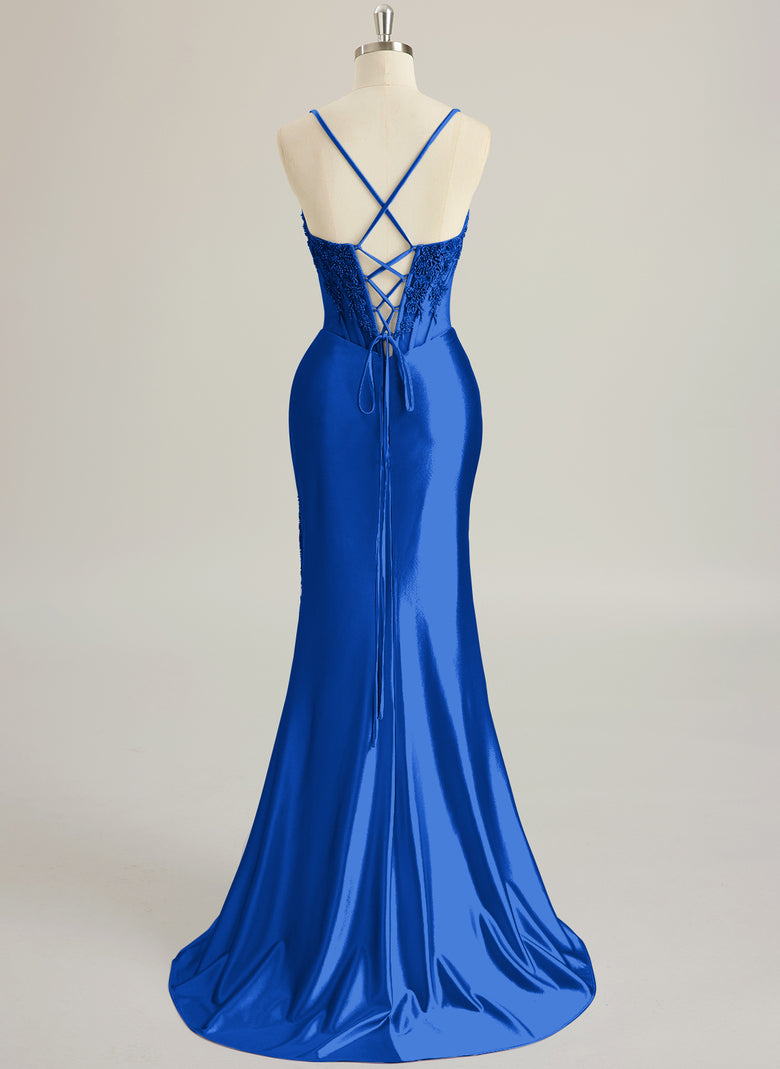 Spaghetti Straps V-Neck Sexy Vintage Beautiful Back Corset Modest Prom Dresses Beading Appliques Lace Silky Satin Trumpet/Mermaid Maxi Dress With Leg Slit